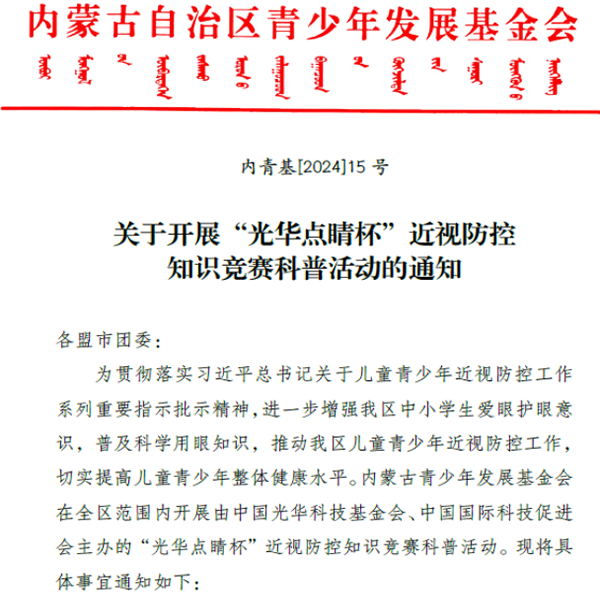 2024年4月20日,由中国光华科技基金会、中国国际科技促进会主办,内蒙古自治区青少年发展基金会及光华点睛公益计划青少年近视防控专家委员会承办的“光华点睛杯”近视防控知识竞赛科普活动(内蒙古赛区)在内蒙古自治区全区范围内正式启动。