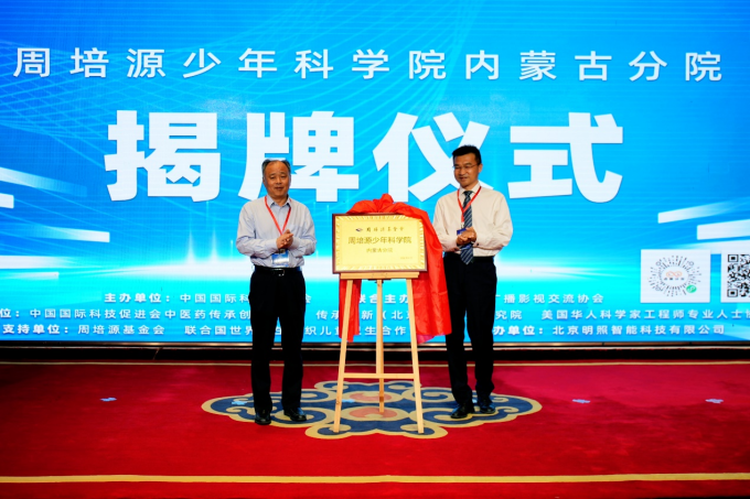 周培源基金会常务副理事长孟庆国先生及中国国际科技促进会常务理事崔志国先生在会议期间共同为周培源少年科学院内蒙古分院揭牌。